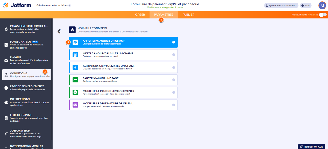 Ensuite, configurez une condition Afficher/Masquer le champ pour afficher le champ correspondant en fonction du mode de paiement choisi par l’utilisateur, que ce soit via PayPal ou par chèque. Voici comment procéder :