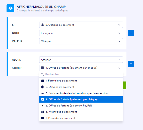 Le principe est simple : la logique affiche uniquement le champ qui correspond au choix de l’utilisateur. Pour cela, vous devez donc configurer deux conditions, une pour chaque mode de paiement :