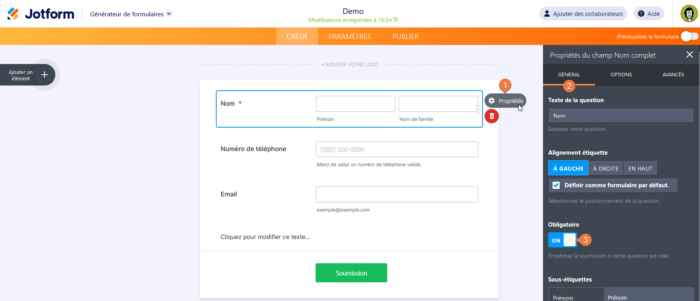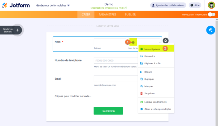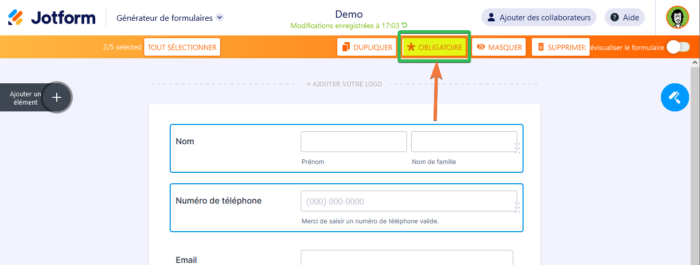 Lorsque vous ajoutez de nouveaux champs à votre formulaire, les champs sont facultatifs par défaut. Cela signifie que vos utilisateurs peuvent soumettre le formulaire sans remplir ces champs. Si vous souhaitez que le champ soit exigé, vous devez définir le champ comme obligatoire.