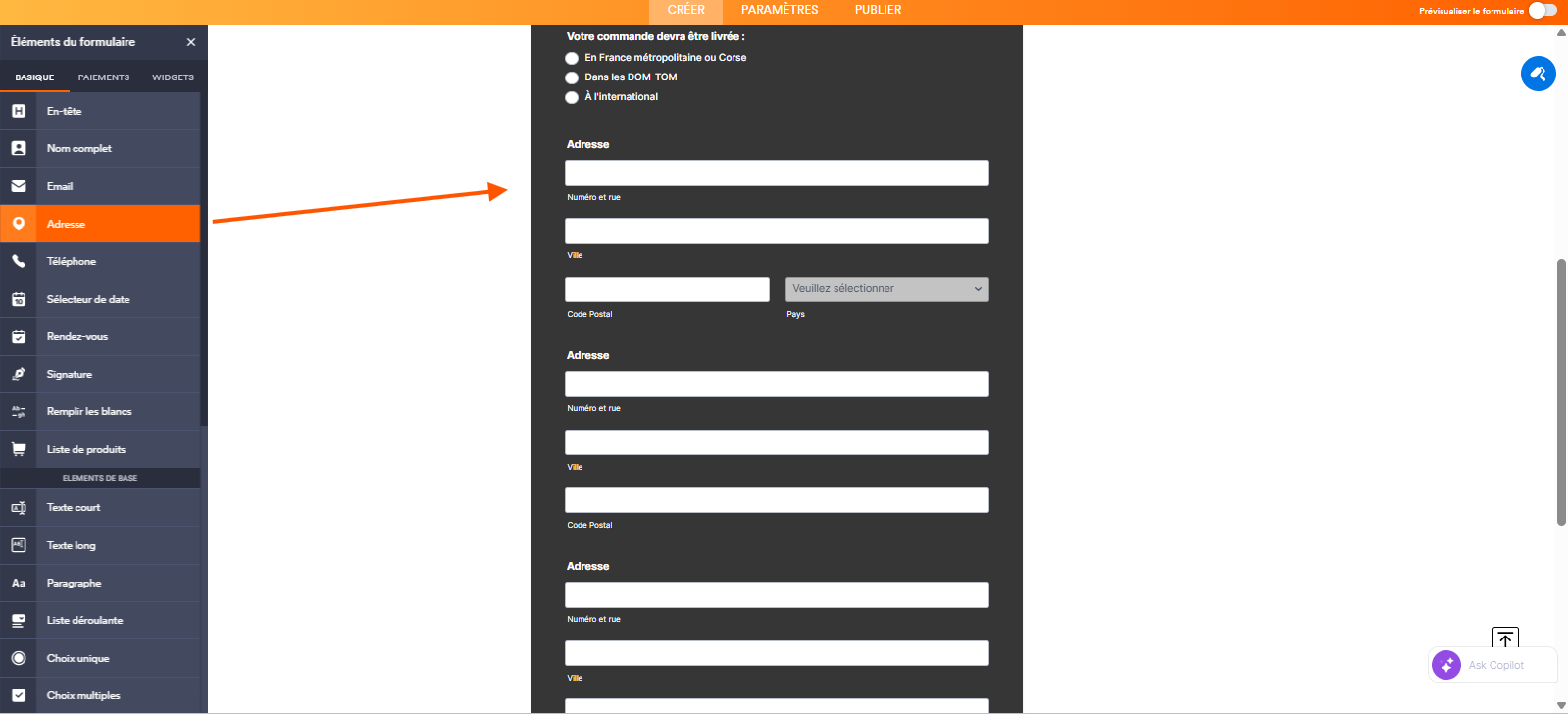 - Ajoutez un élément Choix unique comprenant les options proposée, comme sélecteur d’adresse, plus 3 éléments Adresse à votre formulaire, un pour chaque type d’adresse.
