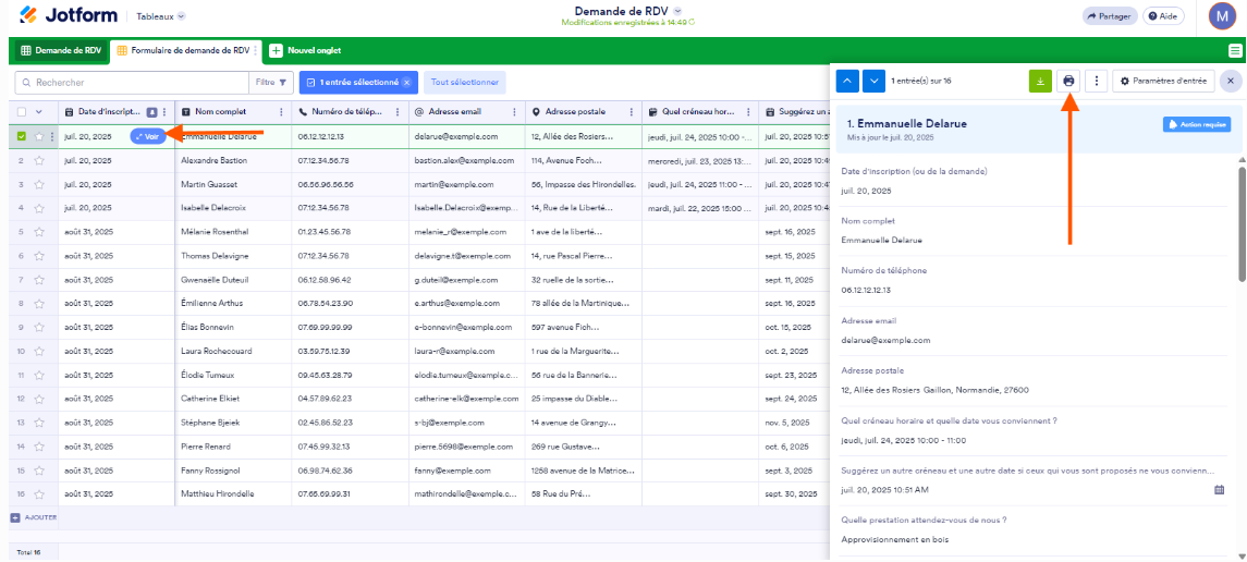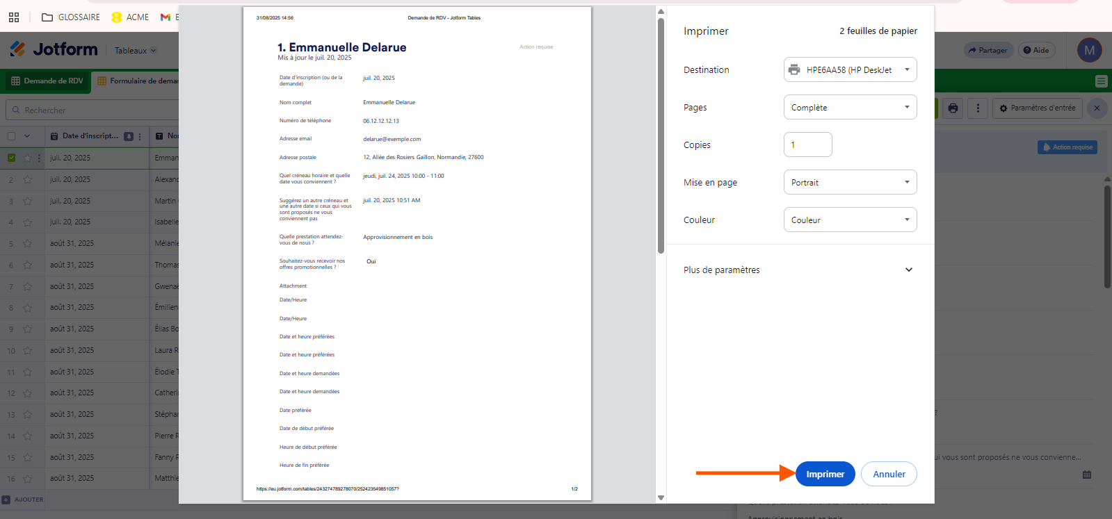 Les documents papier restent parfois plus pratiques, par exemple lors d’une présentation ou dans un endroit où l’accès à internet est limité. Si vous avez besoin d’une version imprimée des données de votre formulaire, vous pouvez facilement générer une copie papier à partir des Tableaux Jotform.