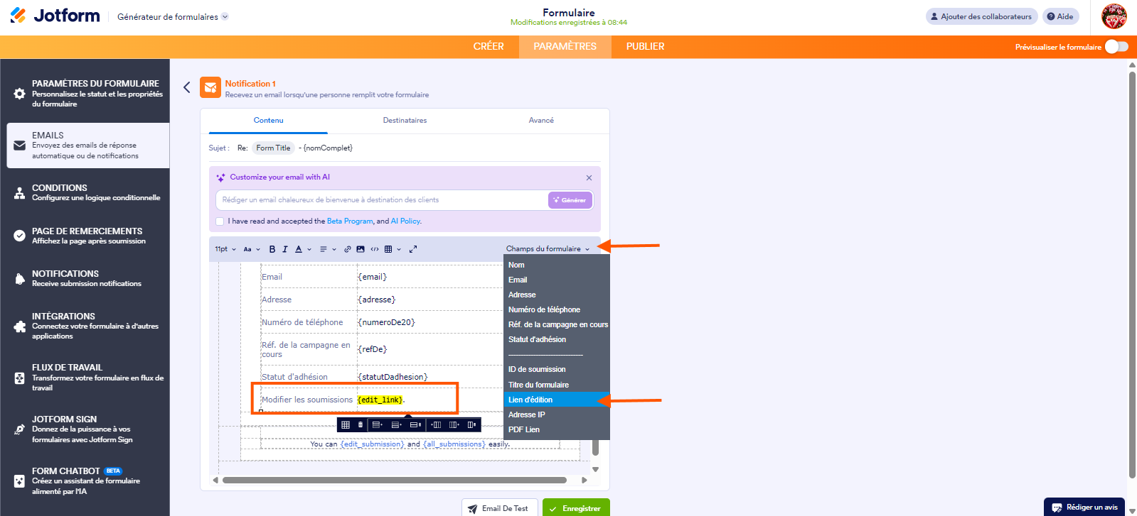 {edit_link}. Vous pouvez la saisir manuellement ou cliquer sur le bouton Champs de formulaire dans la barre d’outils pour l’ajouter.