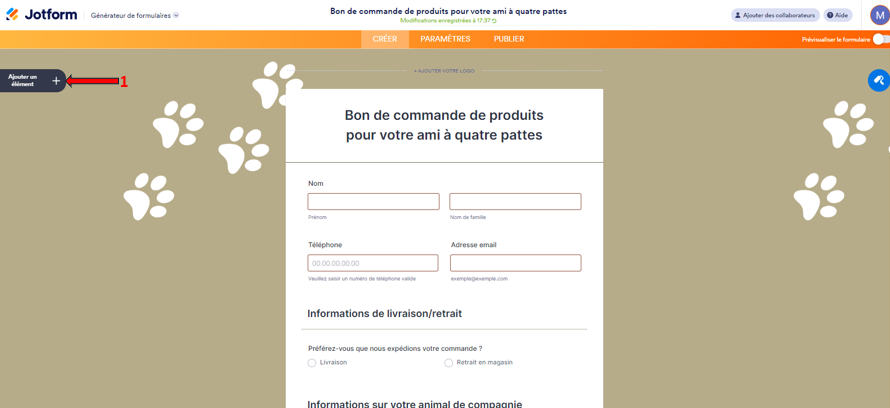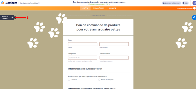 - Dans le Générateur de formulaires, cliquez sur le bouton Ajouter un élément sur le côté gauche de la page.