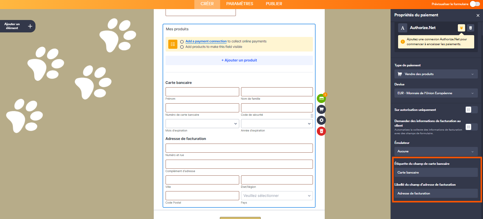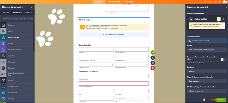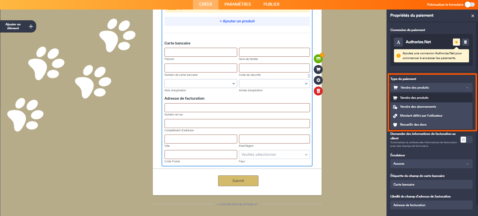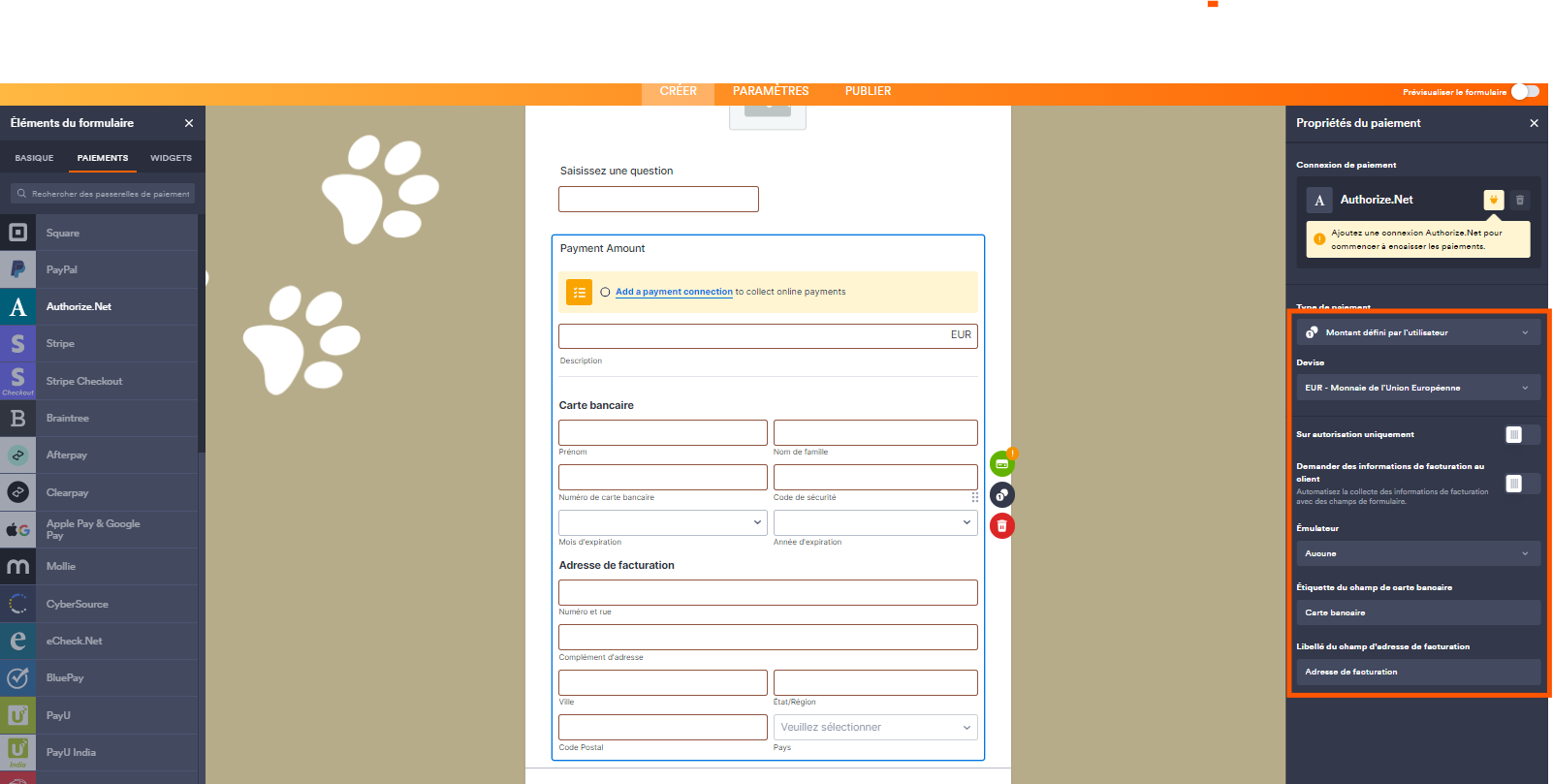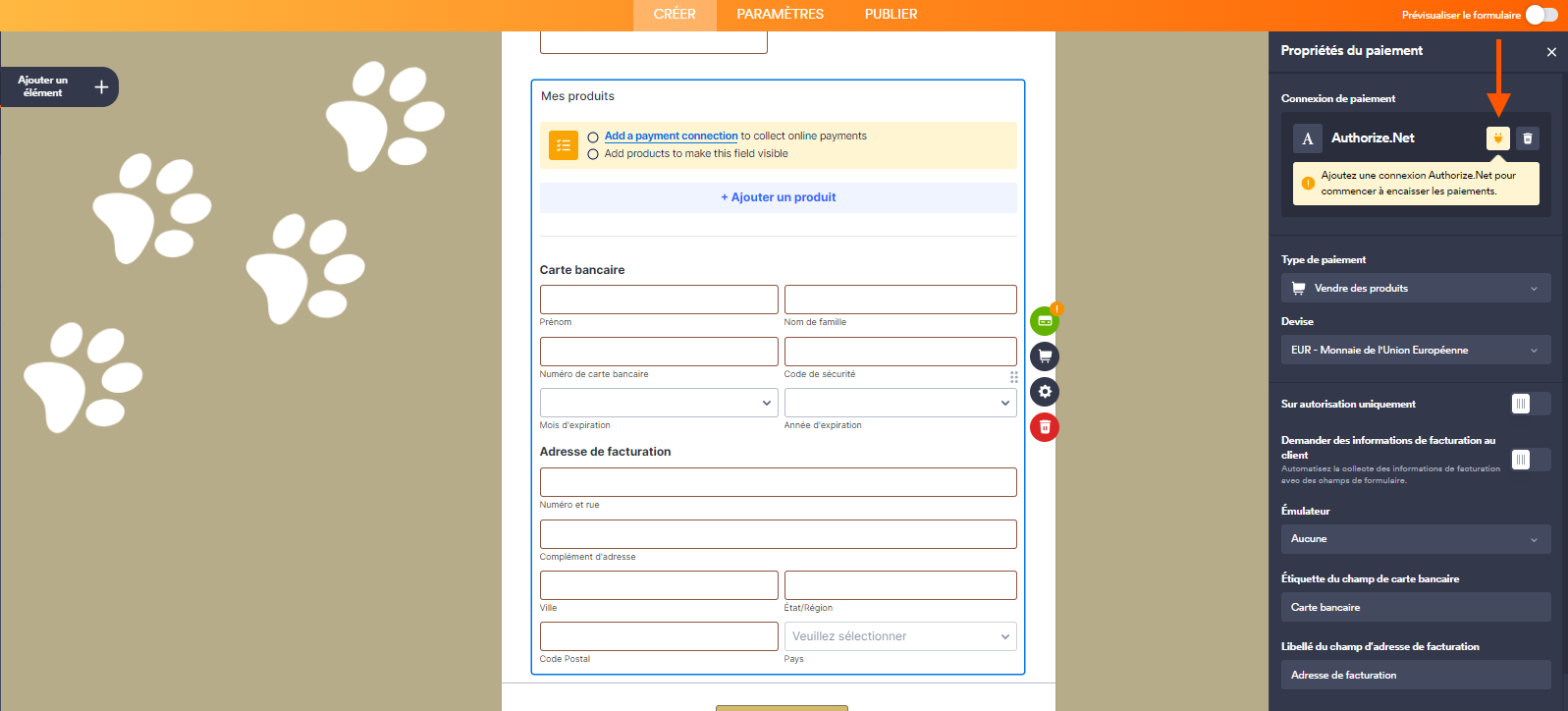Que vous soyez en train de créer un nouveau formulaire ou de mettre à jour un formulaire existant, vous pouvez ajouter un champ de paiement à votre formulaire et configurer une connexion de paiement réutilisable Authorize.Net en quelques étapes simples. Voici comment procéder :