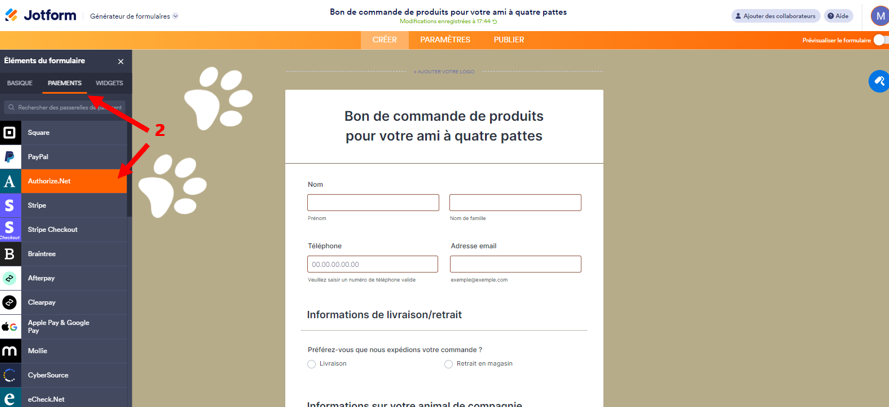 - Dans la liste déroulante des Éléments du formulaire, sous l’onglet Paiements, cliquez sur Authorize.Net. Vous pouvez également l’ajouter par glisser-déposer à l’endroit souhaité sur votre formulaire.