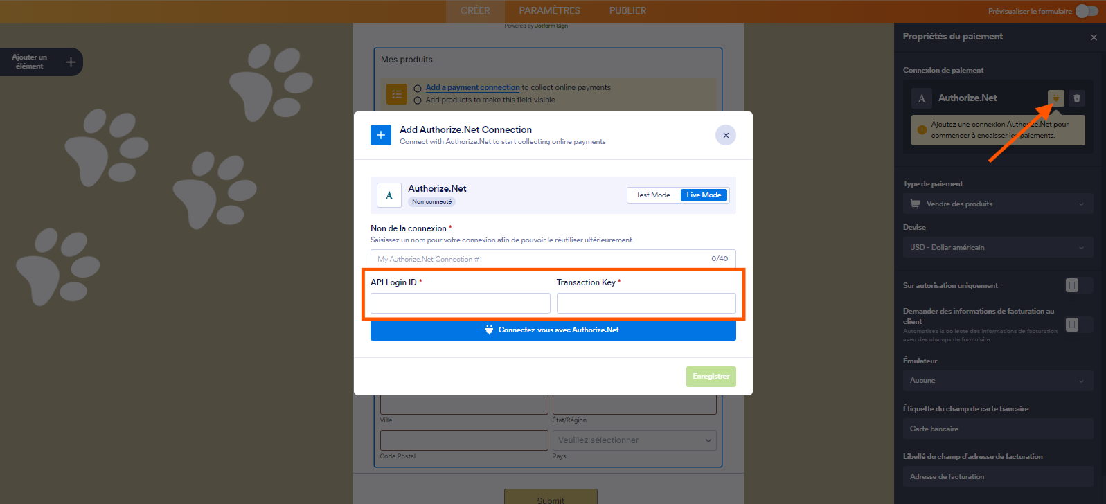 - Puis, dans le volet Propriétés du paiement qui s’ouvre à droite, cliquez sur l’icône de plug, au-dessus du message « Ajoutez une connexion Authorize.Net pour commencer à encaisser les paiements. », puis dans le fenêtre contextuelle qui s’ouvre, saisissez l’ID de connexion API ainsi que la clé de transaction de votre compte Authorize.Net. Si vous ne savez pas comment les obtenir, consultez notre guide intitulé Comment obtenir l’ID de connexion API et la clé de transaction pour Authorize.Net.