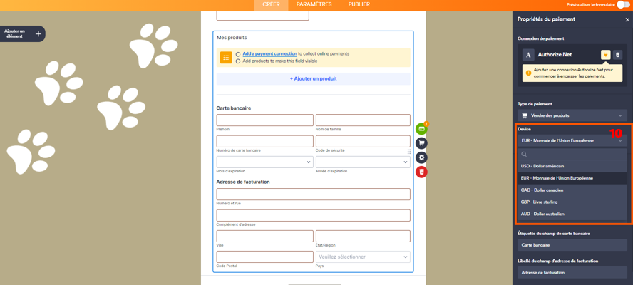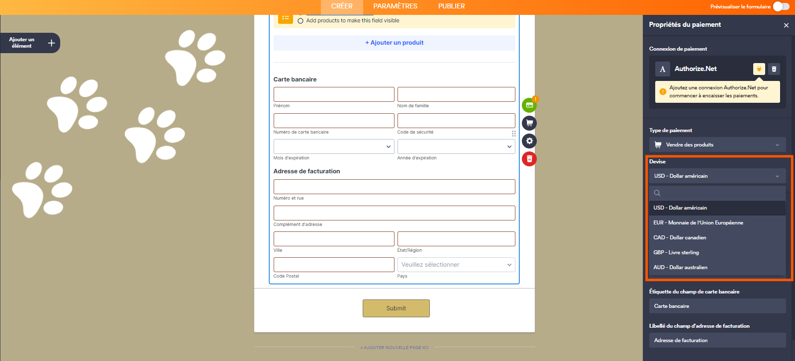 - Cliquez ensuite dans le champ sous Devise du volet Propriétés du paiement et sélectionnez l’une des devises disponibles pour cette intégration :