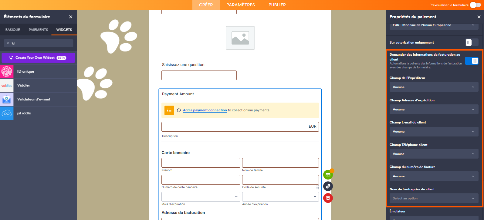 - Champ Numéro de facture : sélectionnez le widget ID unique ou un champ Texte court correspondant à ce champ de facturation.