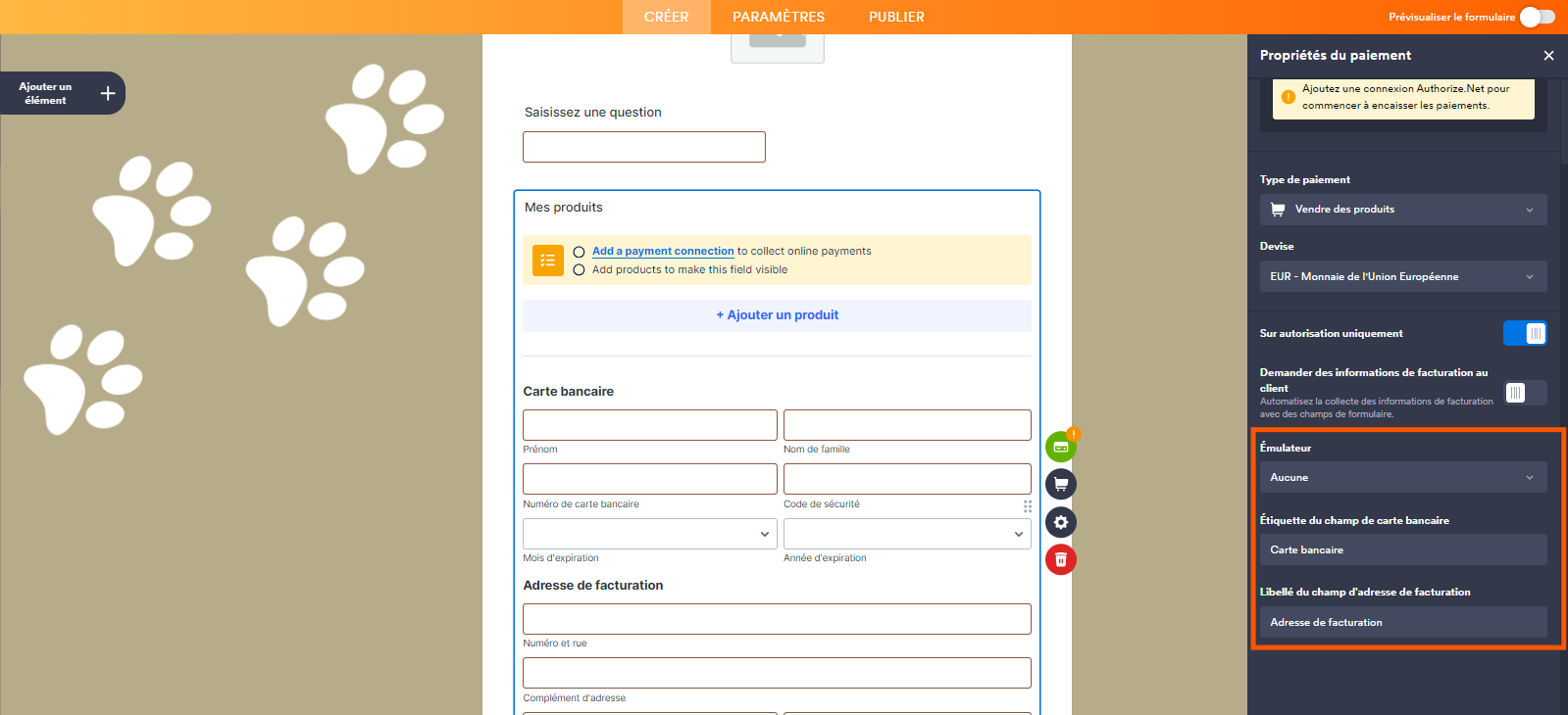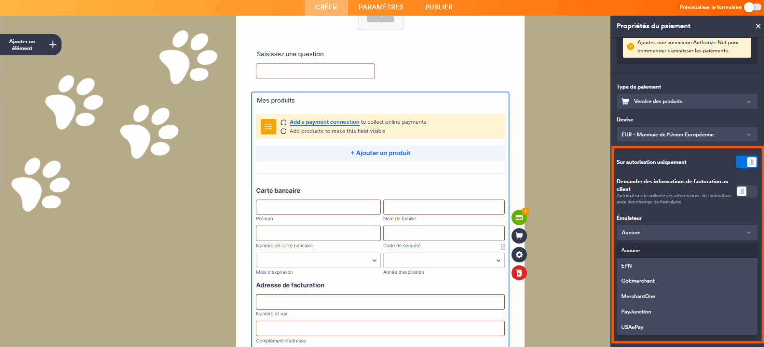 - Émulateur : cette option peut être utilisée pour intégrer vos formulaires avec les passerelles de paiement suivantes qui ne sont pas encore directement prises en charge, mais qui peuvent fonctionner en émulant le framework Authorize.Net :