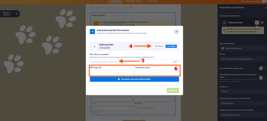 - Ensuite, dans la fenêtre Ajouter une connexion Authorize.Net, cliquez sur Test Mode ou Live Mode en haut afin de sélectionner l’environnement pour lequel vous ajoutez une connexion de paiement.