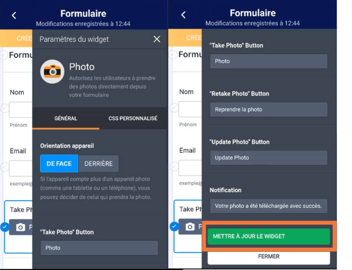 3- Une fois que vous avez ajouté le widget, les paramètres du widget apparaîtront automatiquement sur le côté droit de l’écran. Vous pouvez basculer pour sélectionner l’Orientation appareil à utiliser, DE FACE ou DERRIERE.