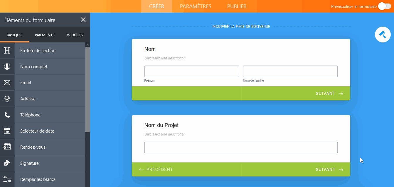 - Accédez à l’onglet Paramètres dans le Générateur de formulaires.