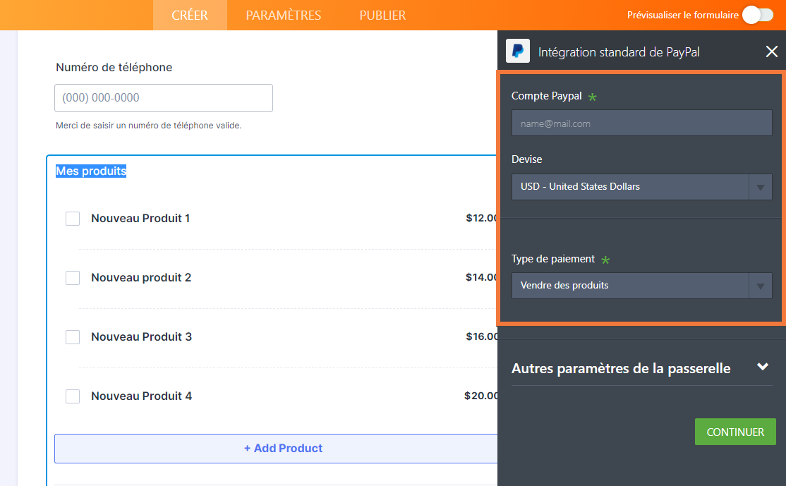 Pour cet exemple, nous allons utiliser PayPal Personnel pour illustrer comment créer un formulaire de commande avec intégration de paiement. Cependant, ce guide s’applique à tous nos outils de paiement. Suivez les instructions vidéo ou textuelles ci-dessous pour configurer votre premier formulaire de commande.