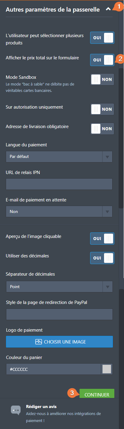 - Développez la section Autres Paramètres de passerelle et définissez l’option Afficher le prix total sur le formulaire sur Oui. Faites défiler vers le bas et appuyez sur le bouton Continuer pour l’enregistrer.