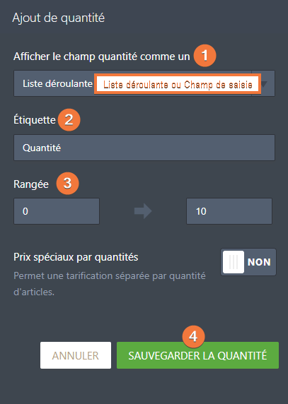 - Sélectionnez Liste déroulante ou Champ de Saisie dans l’option Afficher le champ quantité. Définissez l’étiquette et la plage souhaitées, puis cliquez sur le bouton Sauvegarder la quantité.