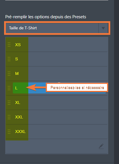 - Cliquez à nouveau sur le bouton Ajouter dans la section Ajouter une option de produit et cette fois, sélectionnez Taille du t-shirt dans la section Remplir les options à partir des préréglages.Vos modifications seront enrégistré automatiquement.
