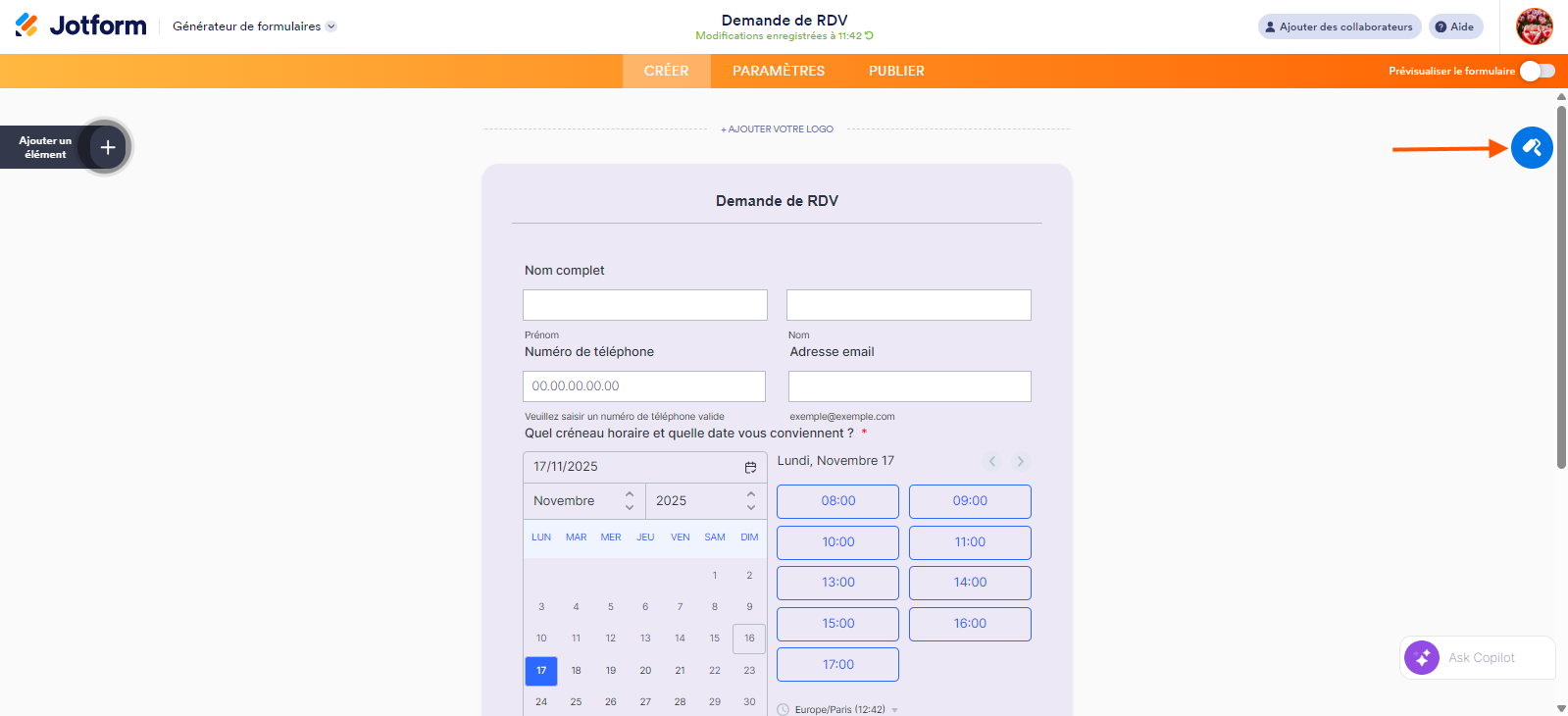 - Accédez à votre formulaire dans le Générateur de formulaires Jotform et cliquez sur l’icône de rouleau à peinture situé à droite de la page afin d’ouvrir le Concepteur de formulaires.
