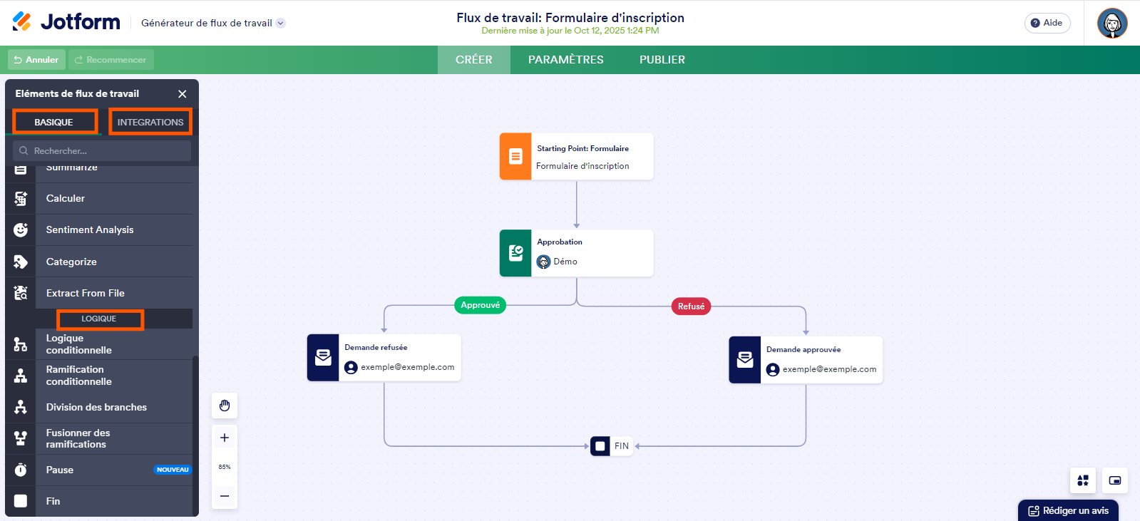 Dans le Générateur de flux de travail Jotform, un volet Éléments de flux de travail apparaît à gauche, avec un onglet Basique et Logique et un deuxième onglet Intégrations.