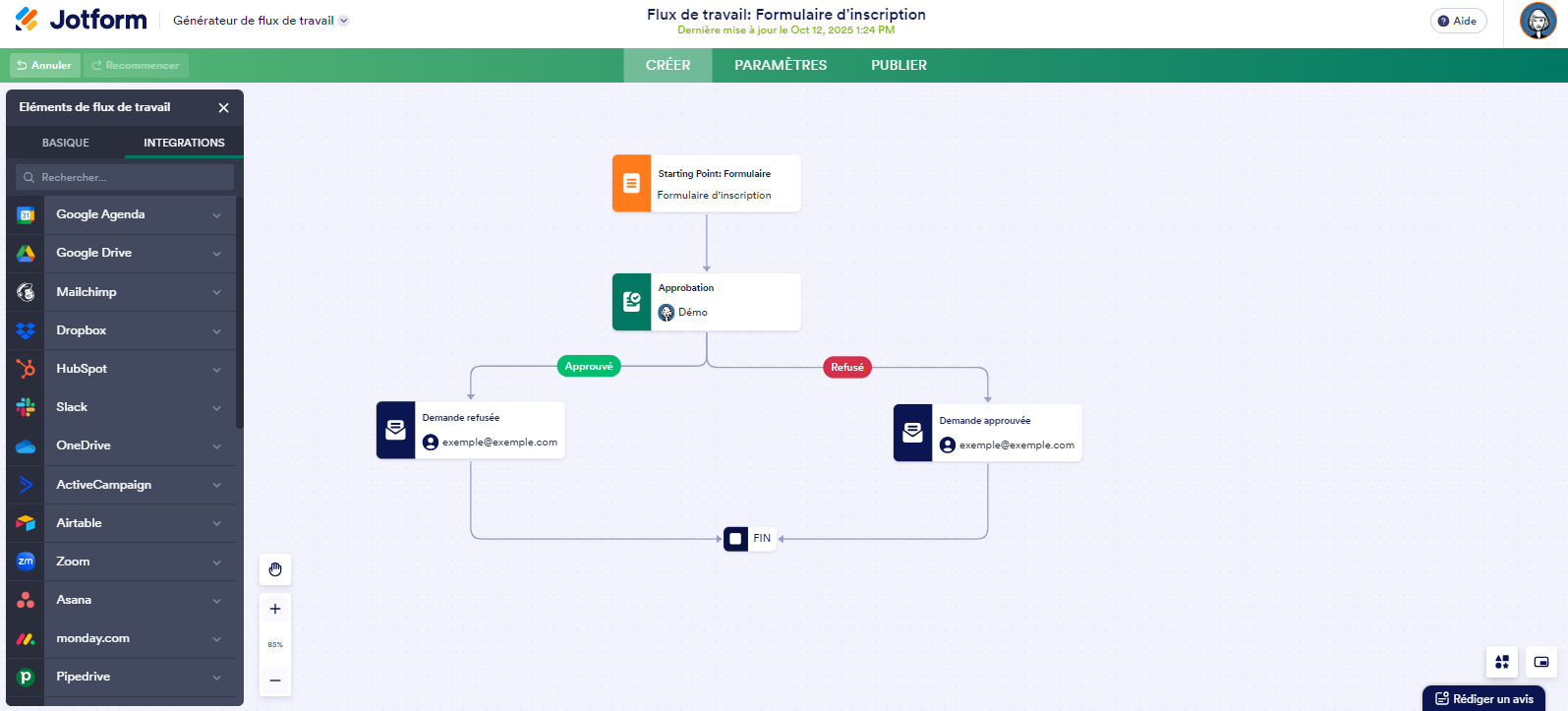 Grâce aux intégrations, les Flux de travail Jotform vous permettent également d’intégrer votre flux de travail à une sélection d’applications tierces afin d’envoyer vos données lorsqu’il s’exécute.
