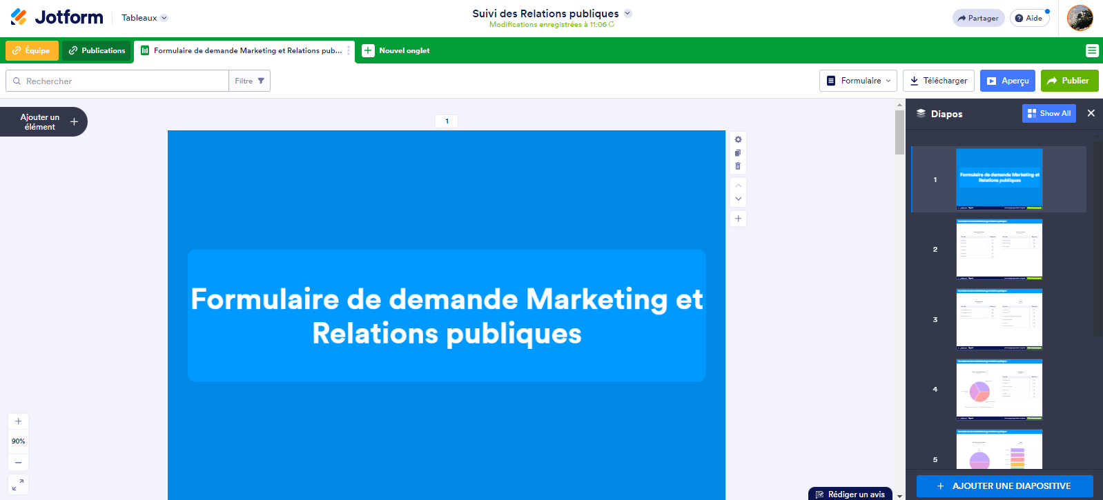 Pour favoriser un flux de travail fluide, nous avons intégré les fonctionnalités de génération de rapports du générateur de rapports Jotform directement dans les Tableaux Jotform, vous permettant ainsi de créer rapidement une présentation personnalisable sans avoir à quitter l’espace de travail de votre équipe.