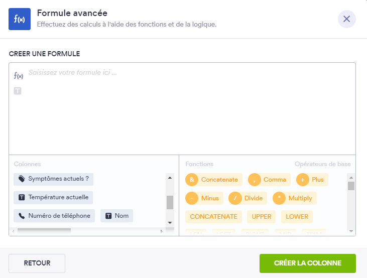 Lors de la création de la nouvelle colonne, il suffit de définir une formule ou une équation utilisant des valeurs provenant d’autres colonnes de la feuille de calcul, ainsi que des fonctions mathématiques et des opérateurs de base, notamment pour la multiplication, la division, l’addition et la soustraction.