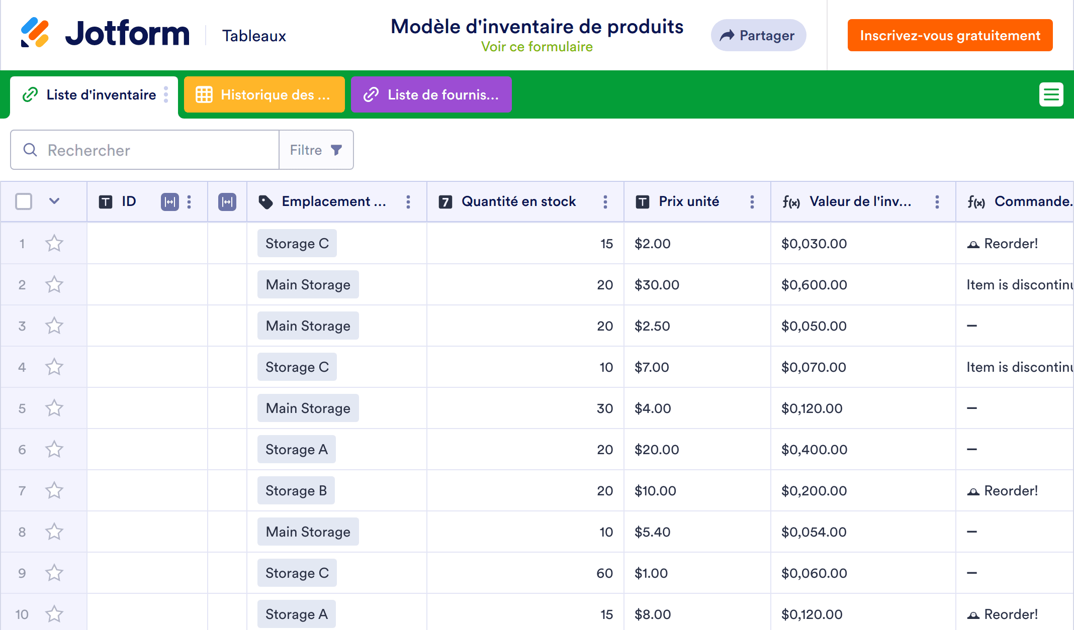 L'inventaire des produits est utilisé pour enregistrer des informations sur le nombre de biens et de produits disponibles proposés par votre entreprise. Commencez par entrer le nom d'un produit, le numéro d'identification d'inventaire, la description, le fournisseur, l'emplacement du stock, le prix unitaire et la quantité. Une fois que vous avez ajouté toutes les informations dont vous avez besoin à votre modèle d'inventaire de produits, elles seront stockées en toute sécurité dans votre compte Jotform sécurisé. Vous pouvez ensuite accéder et modifier les données d'inventaire importantes n'importe où, n'importe quand, même sans accès à Internet.