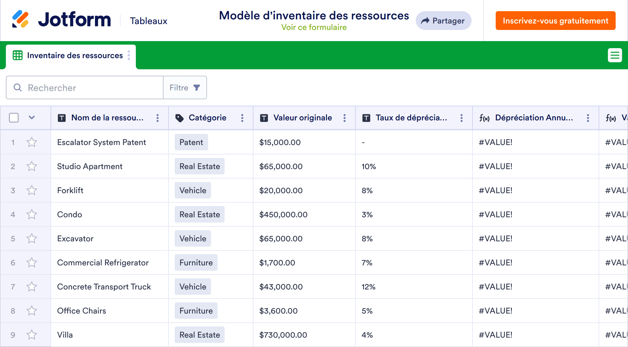 Vous souhaitez afficher les éléments de votre modèle d'inventaire d'actifs d'une nouvelle manière ? Ajoutez simplement un nouvel onglet et réorganisez-les comme vous le souhaitez. Par exemple, si vous gérez des actifs pour plusieurs emplacements au sein d'une même entreprise, vous pouvez ajouter de nouveaux onglets pour séparer les éléments par emplacement. Vous pouvez même passer à une vue de calendrier pour voir clairement vos habitudes de dépenses tout au long de l'année, quels articles sont les plus anciens et lesquels doivent être remplacés bientôt. Avec le modèle d'inventaire des actifs en ligne gratuit de Jotform, vous pouvez gagner du temps, organiser les dossiers de votre entreprise et suivre de manière experte les actifs dans un format de feuille de calcul professionnel.