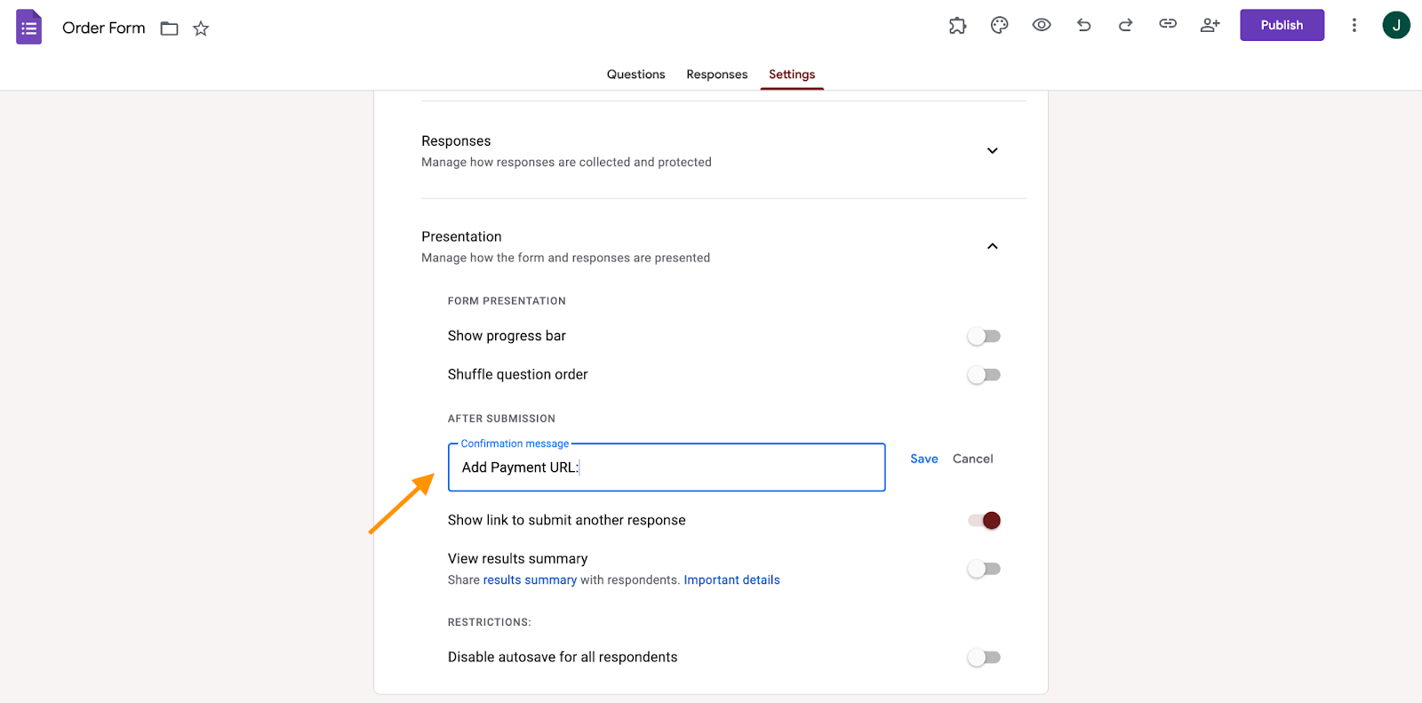 - Once you’ve finalized your Google Form, go to the Presentation tab and update your confirmation message (which appears after the user submits the form).