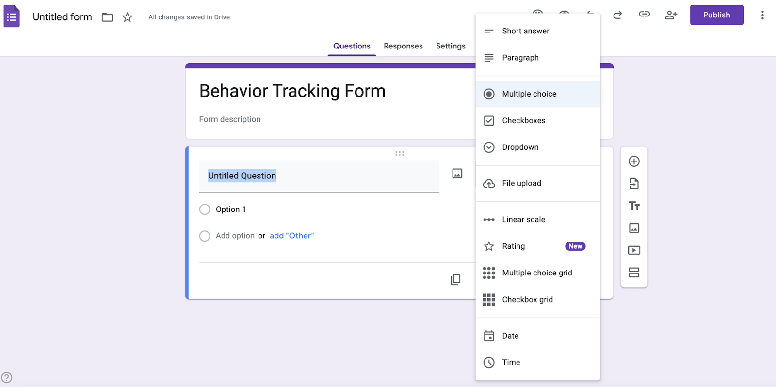 Let’s walk through a few tips that will help you create an effective behavior tracking tool in Google Forms: