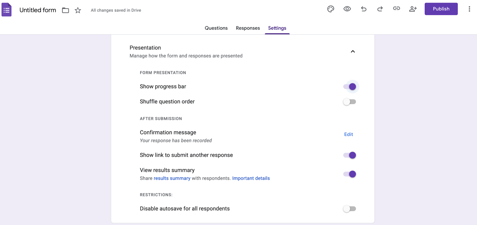 Then click Publish to activate your form and start collecting responses. You can choose whether you want to collect email addresses from respondents as part of the form or keep their responses anonymous. The Results Summary tool provides an overview after you or a student has completed the form.