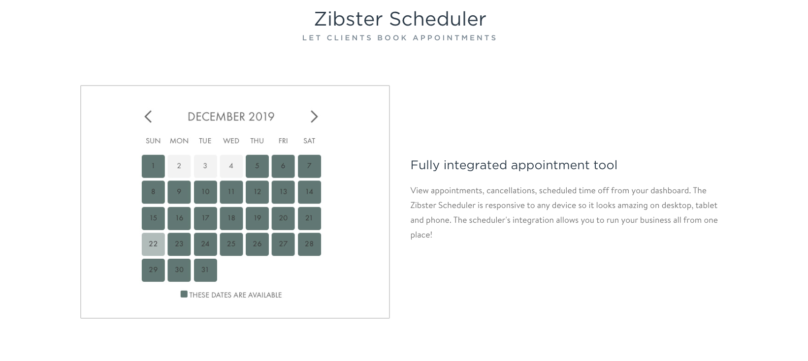 The Zibster Scheduler also allows customers to book appointments online. You can create open time slots in your schedule, block off times when you aren’t available, and even take pre-payments for appointments. By connecting the Scheduler to your personal calendar, you can easily see all of your appointments in one place.