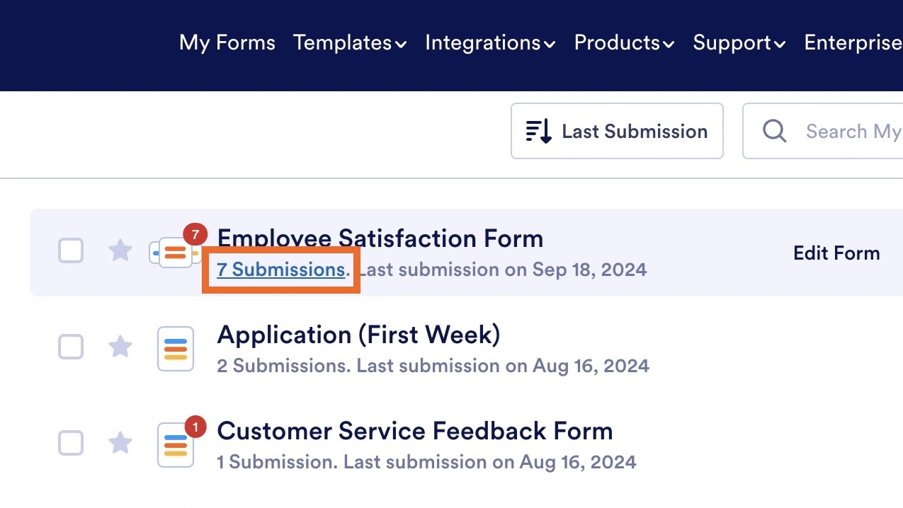 Go to My Forms in Jotform, and select the form you want to review submissions for. You can also click the Create Form button in the top left to make a new form.