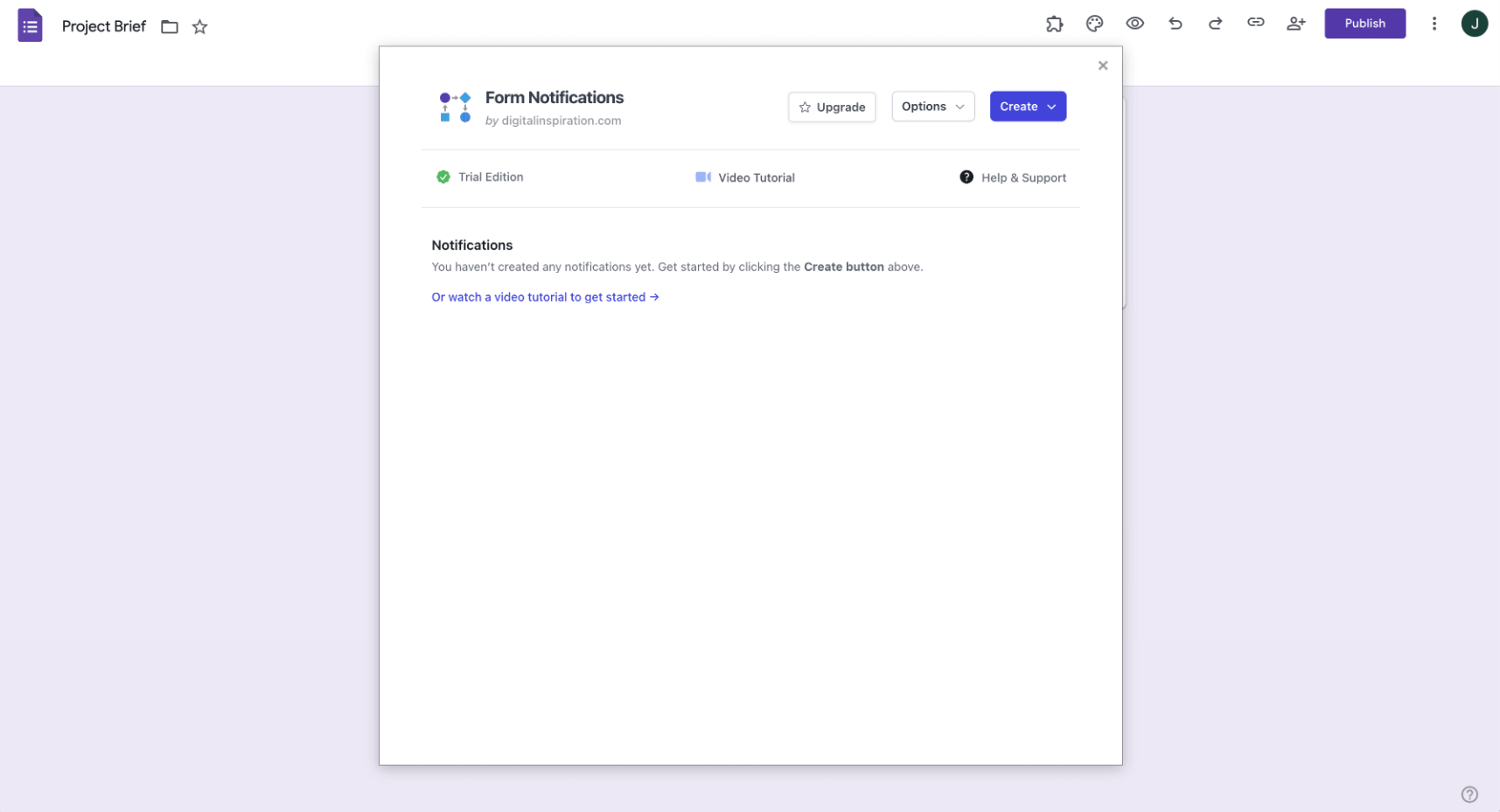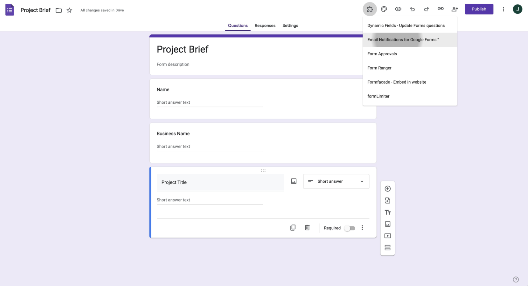 - Select the puzzle piece add-on icon at the top of your form and select Email Notifications for Google Forms.