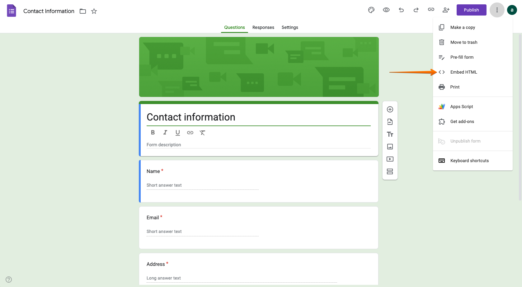- Check that your form is enabled for embedding by navigating to the three dots beside the Publish tab and clicking Embed HTML. If it offers an “<iframe src=”, this implies your Google Form is embed-enabled.