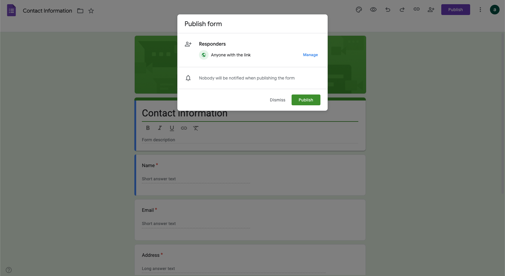 - Sign in to your Google account, then head to Google Forms. Click on the pre-designed template or create your own using the Blank Form option. Once you’re done, click Publish (top right corner) to ensure your form is accessible to everyone.