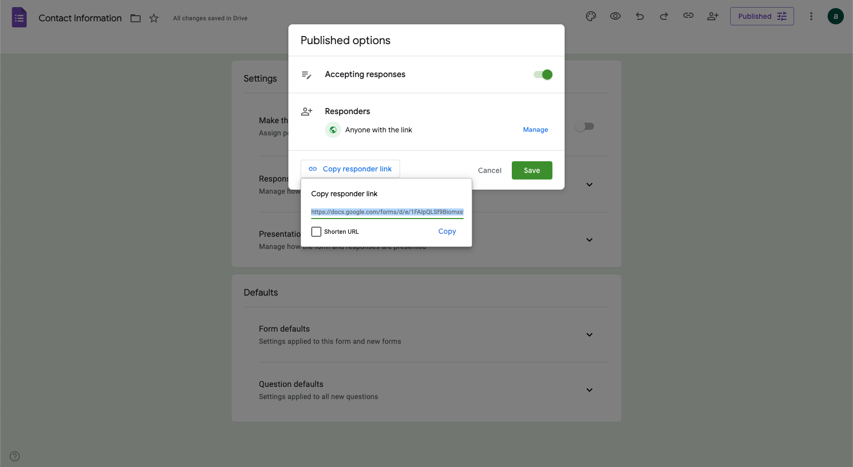 - Next, click the link icon (🔗) to copy the form link. Do not tick the Shorten URL box.