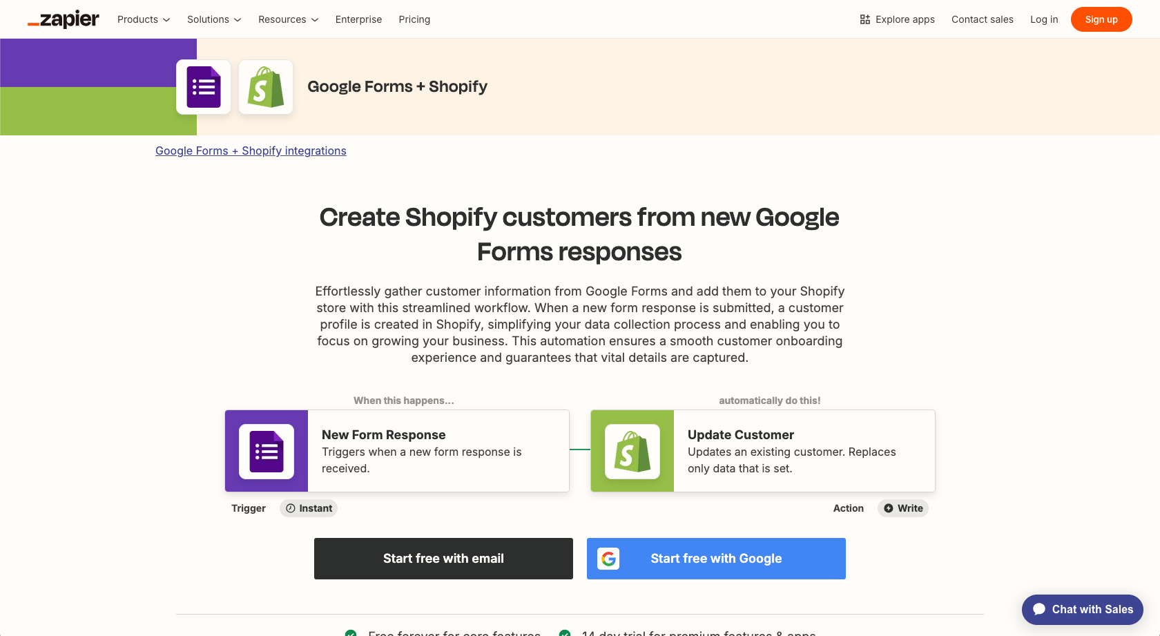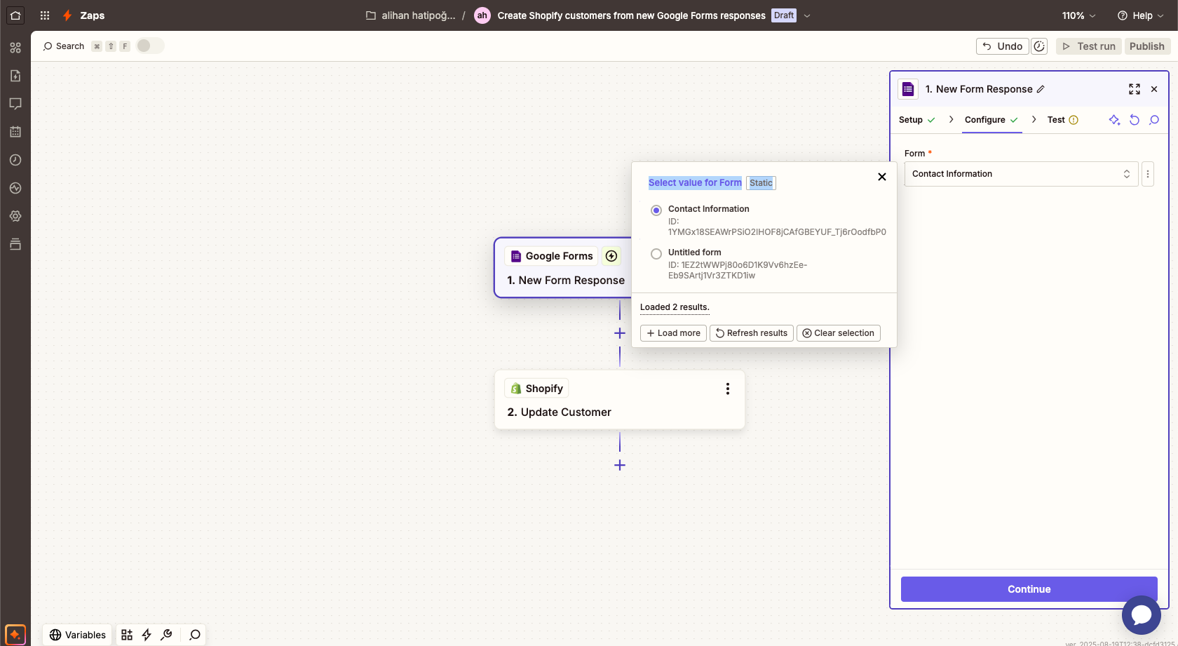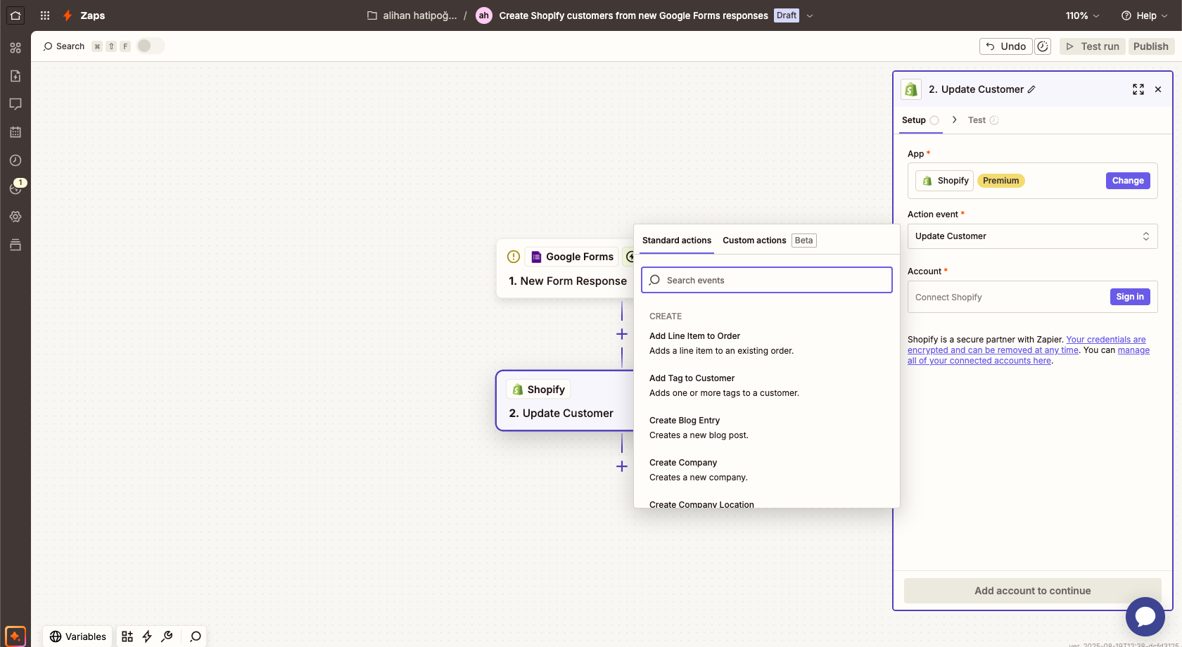 - Pick New Form Response as the trigger from Google Forms and use Create Customer or Update Customer from Shopify as the action. You can also select other actions such as sending notifications, updating product descriptions, or creating new products.