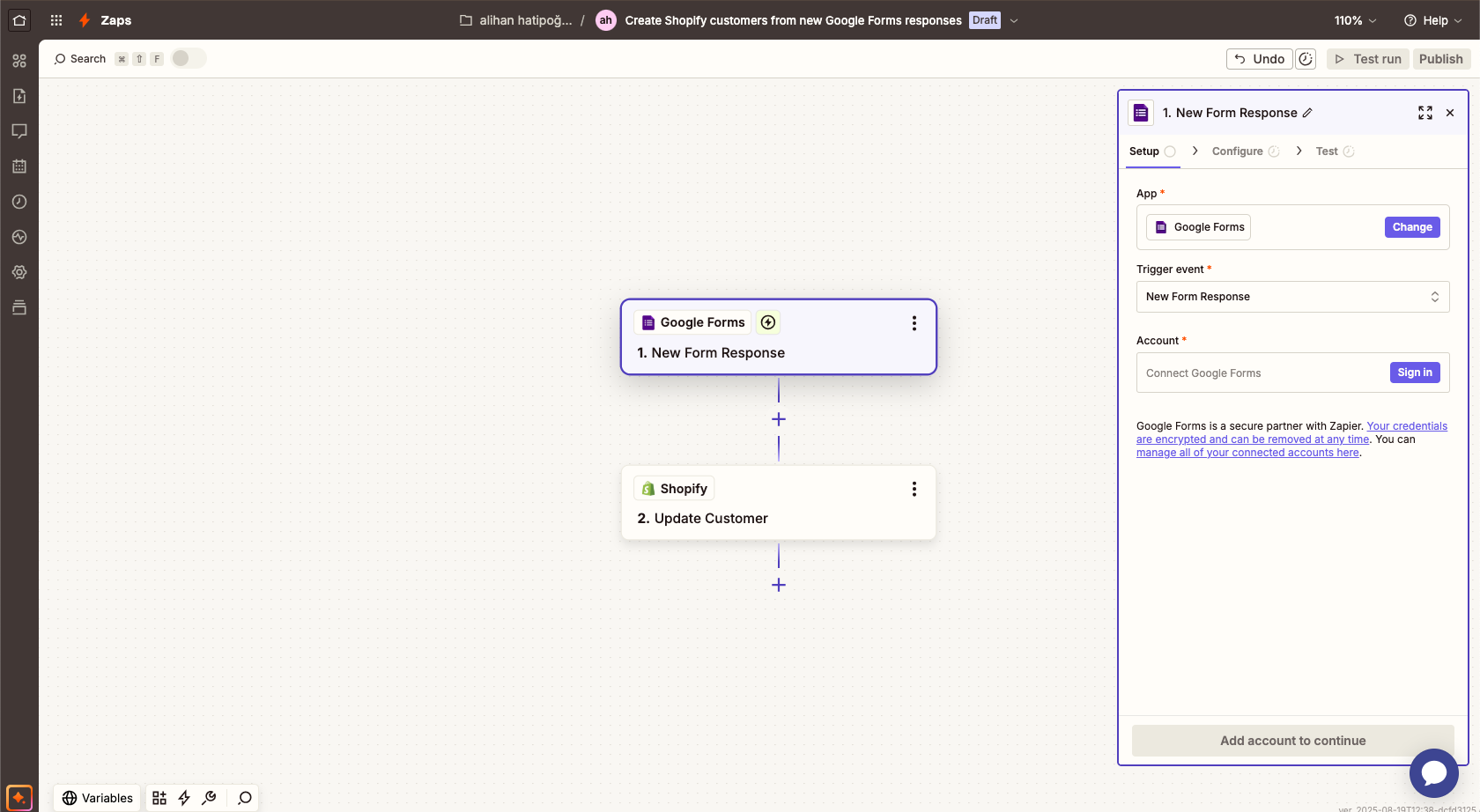 - If you’ve connected your Google account to Zapier already, your Google Forms will automatically show up under the Configure tab. If not, sign in first. Then click Test to see if it’s working.