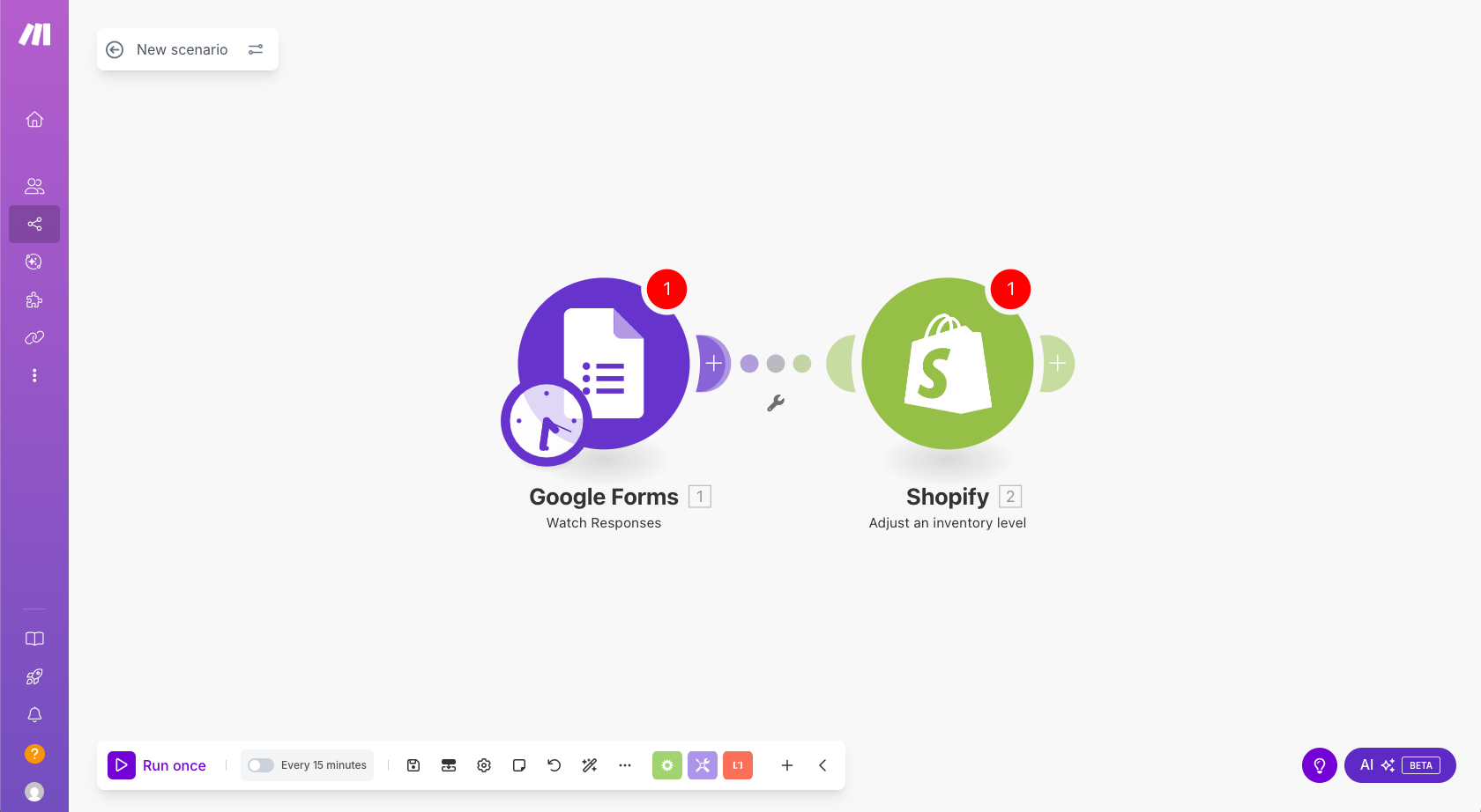 - Test the scenario, then click on Publish to set up your Google Forms Shopify integration via Make.