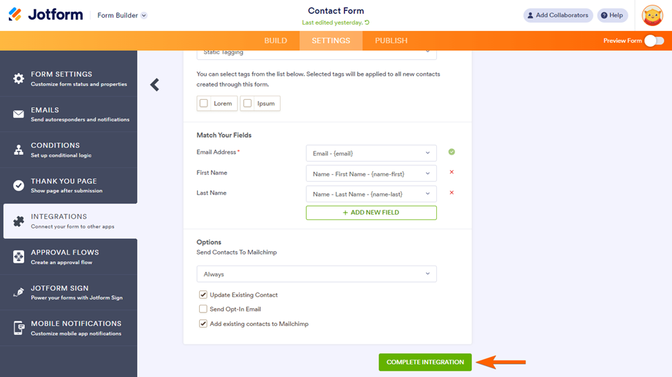- Match Your Fields: Select which fields to map between Mailchimp and Jotform.