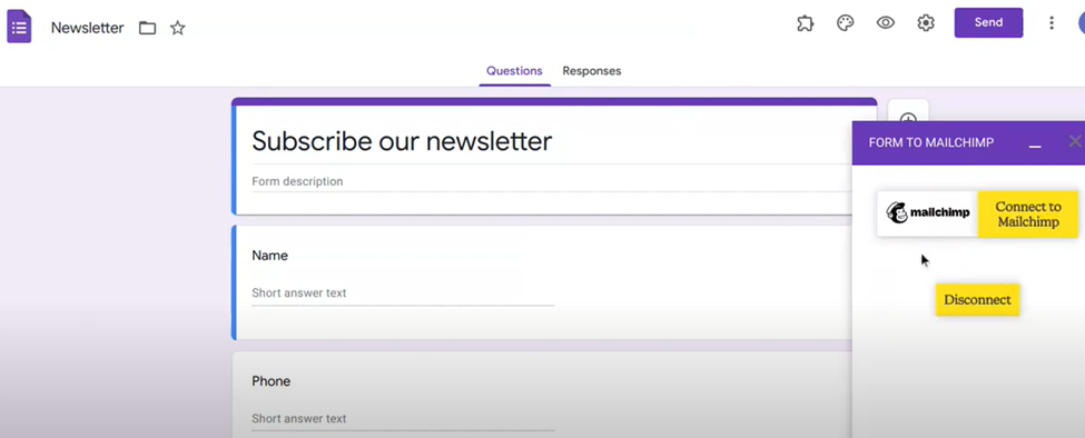 - See the add-on option on the top right-hand side of your Google Form called Form to Mailchimp