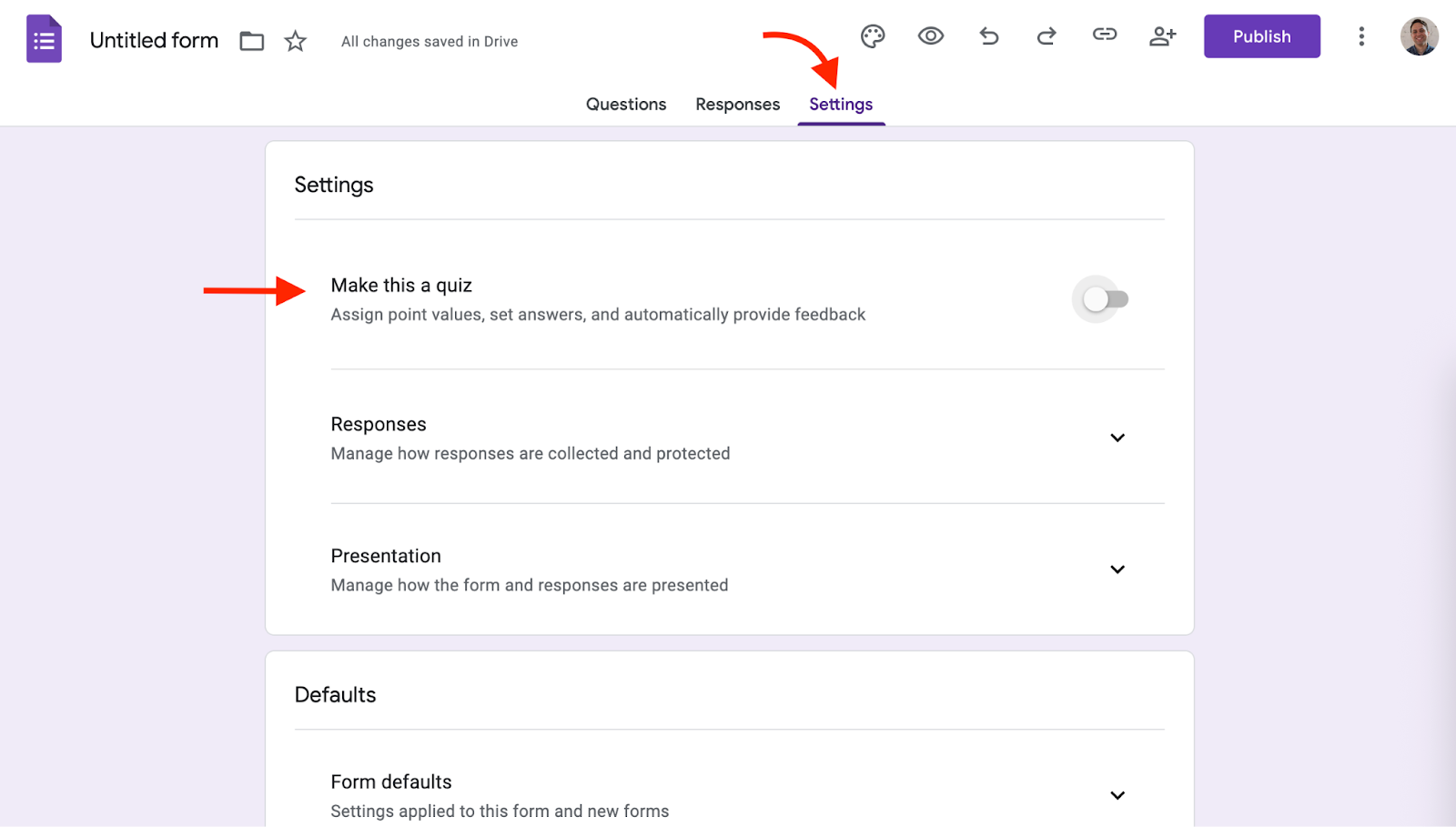 Click the Settings tab in the top-center. Select the option titled Make this a quiz to unlock the ability to assign point values and create answer keys.