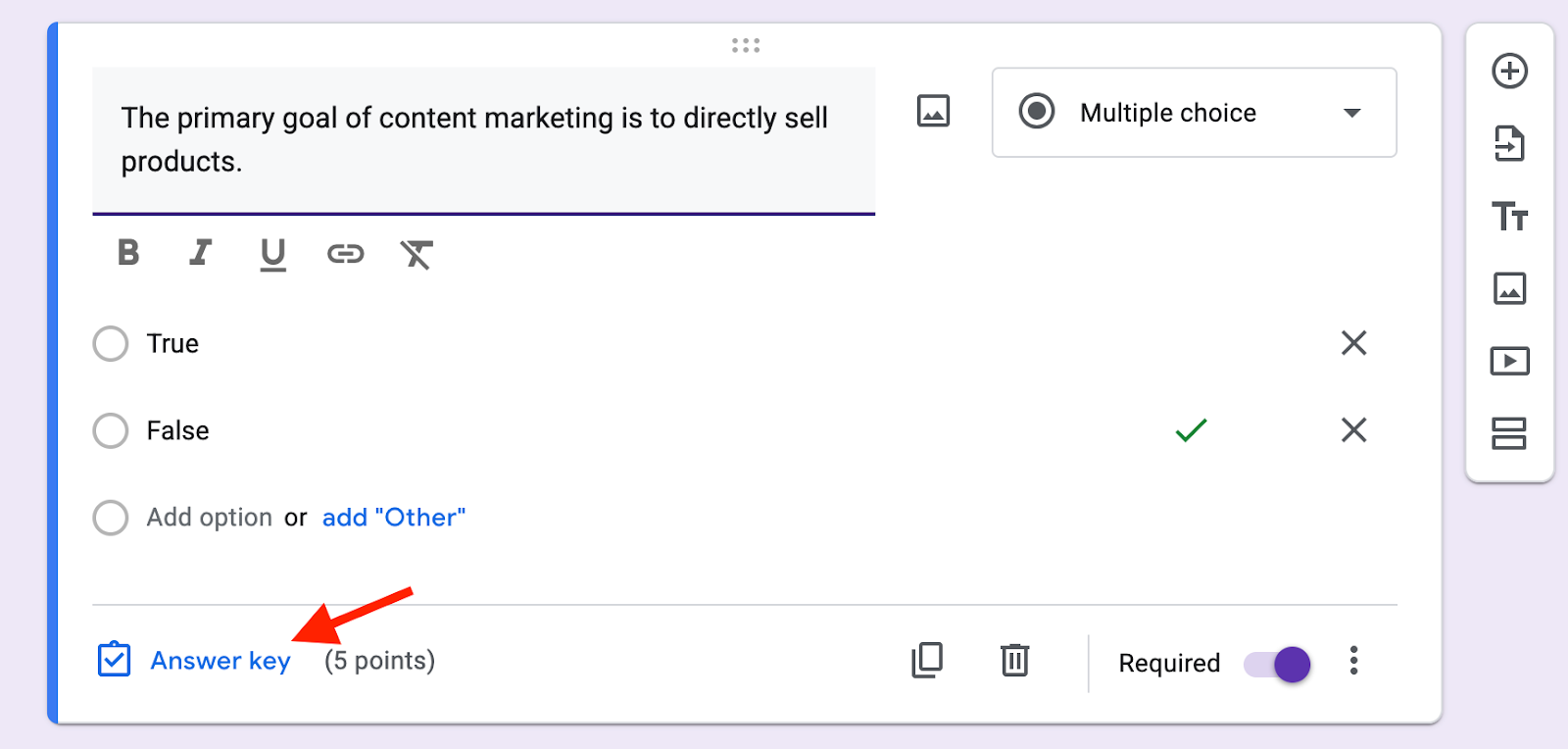 After creating a question, click Answer key at the bottom. Here you can mark the correct answers, assign point values, and even add optional feedback. That feedback can include text, links, or videos — a useful way to reinforce learning or guide participants to further resources.