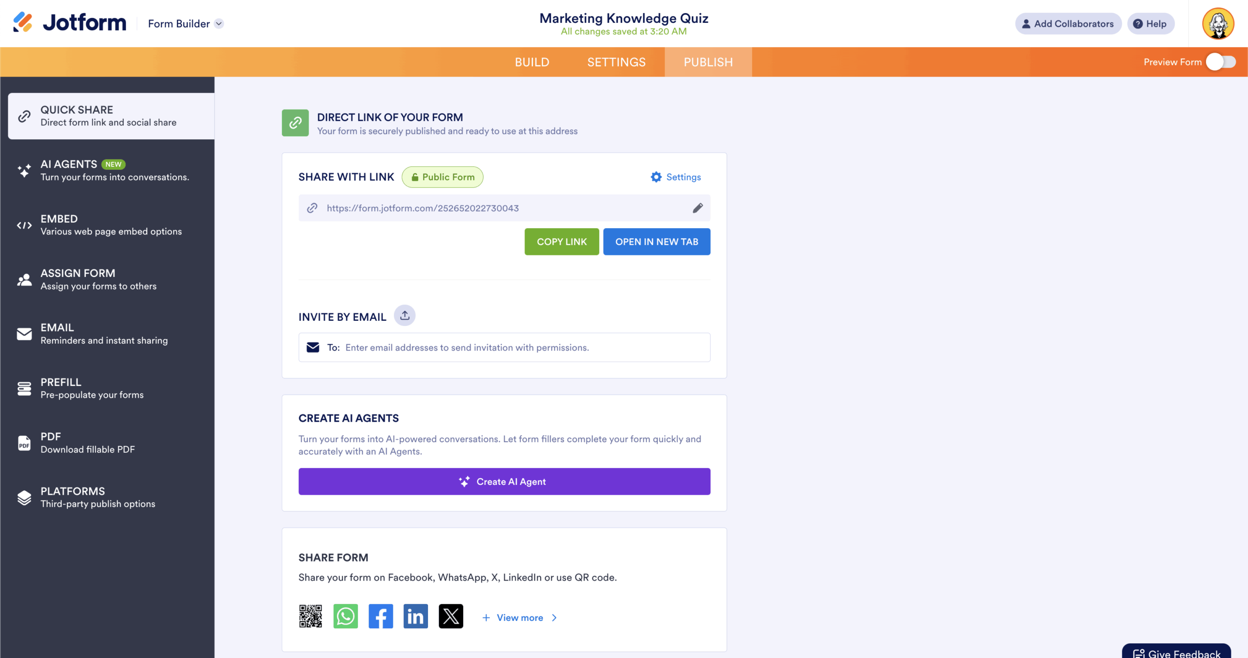 Once your quiz is ready, you can share it as a link, embed it on a website, or distribute it via email and social media.