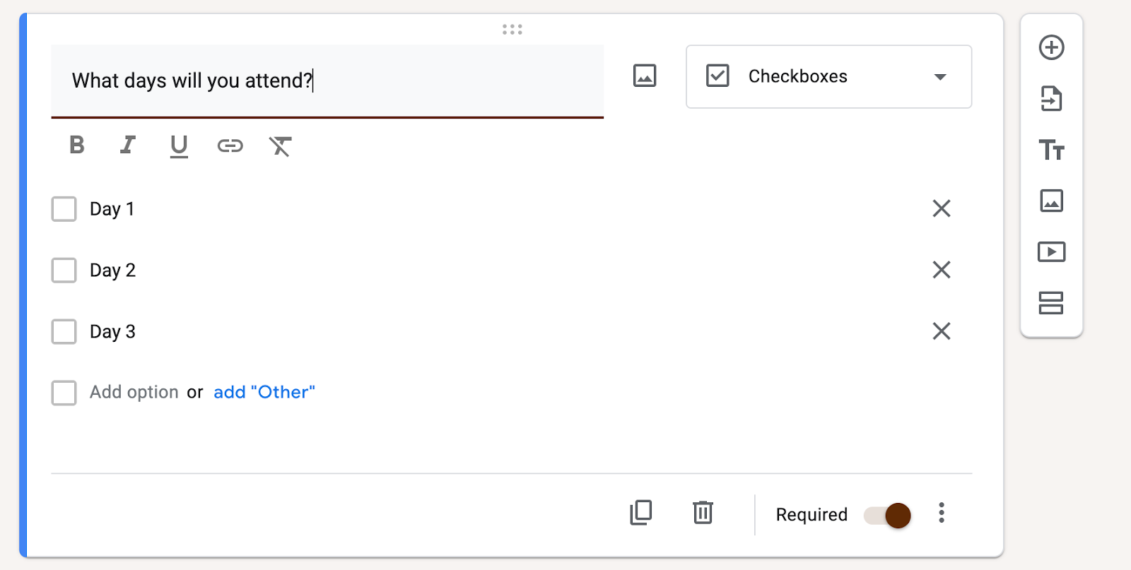 - Checkboxes — Best for when you want respondents to select one or more applicable options from provided answers, like the days they will attend an event