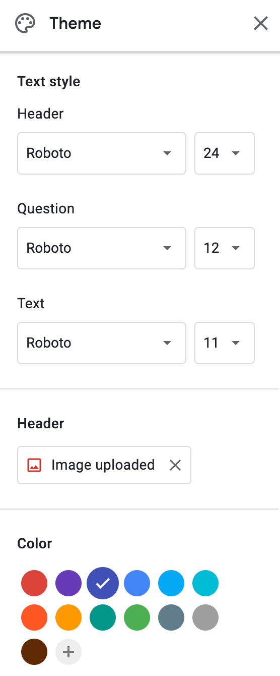 Google Forms’ default design may not align with your own vision for your form. Feel free to customize it by clicking on the artist palette icon in the top right-side menu.