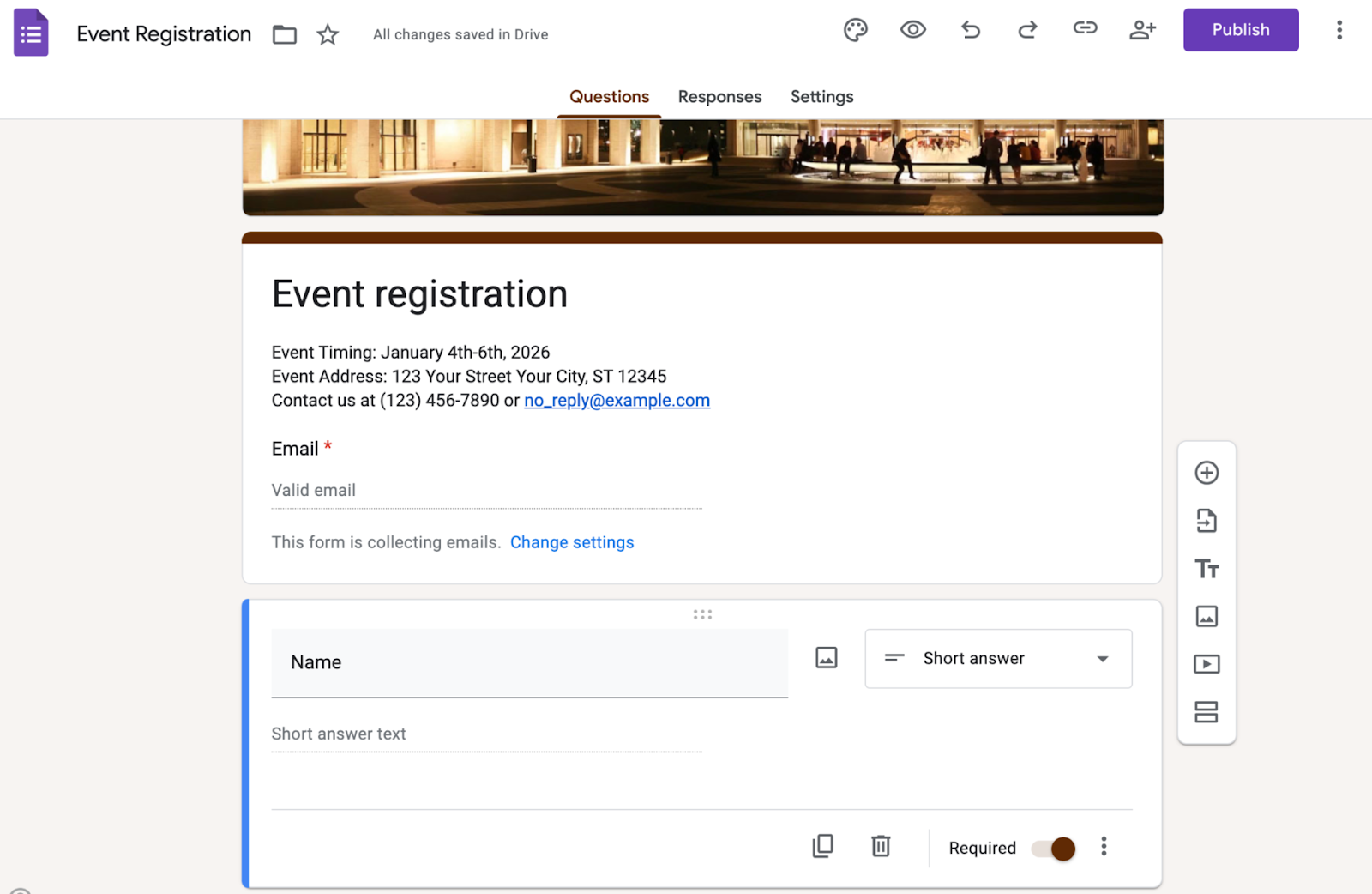 Once you’re happy with all the edits you’ve made to your form, you can click on Publish in the upper right corner of your screen and start sharing the link with the people you want to respond. But before you do, be sure to check out steps three and four first.