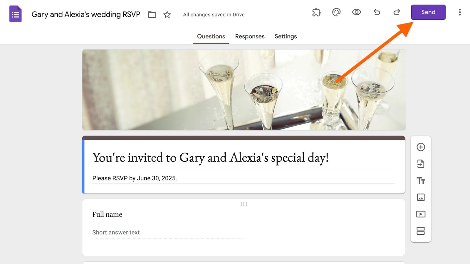 Sending the form link to guests is easy. Simply click on the Send button at the top right of the page to share your form via email, link, or embed. You can choose whether or not your form will automatically collect email addresses, so guests won’t have to type out their own.