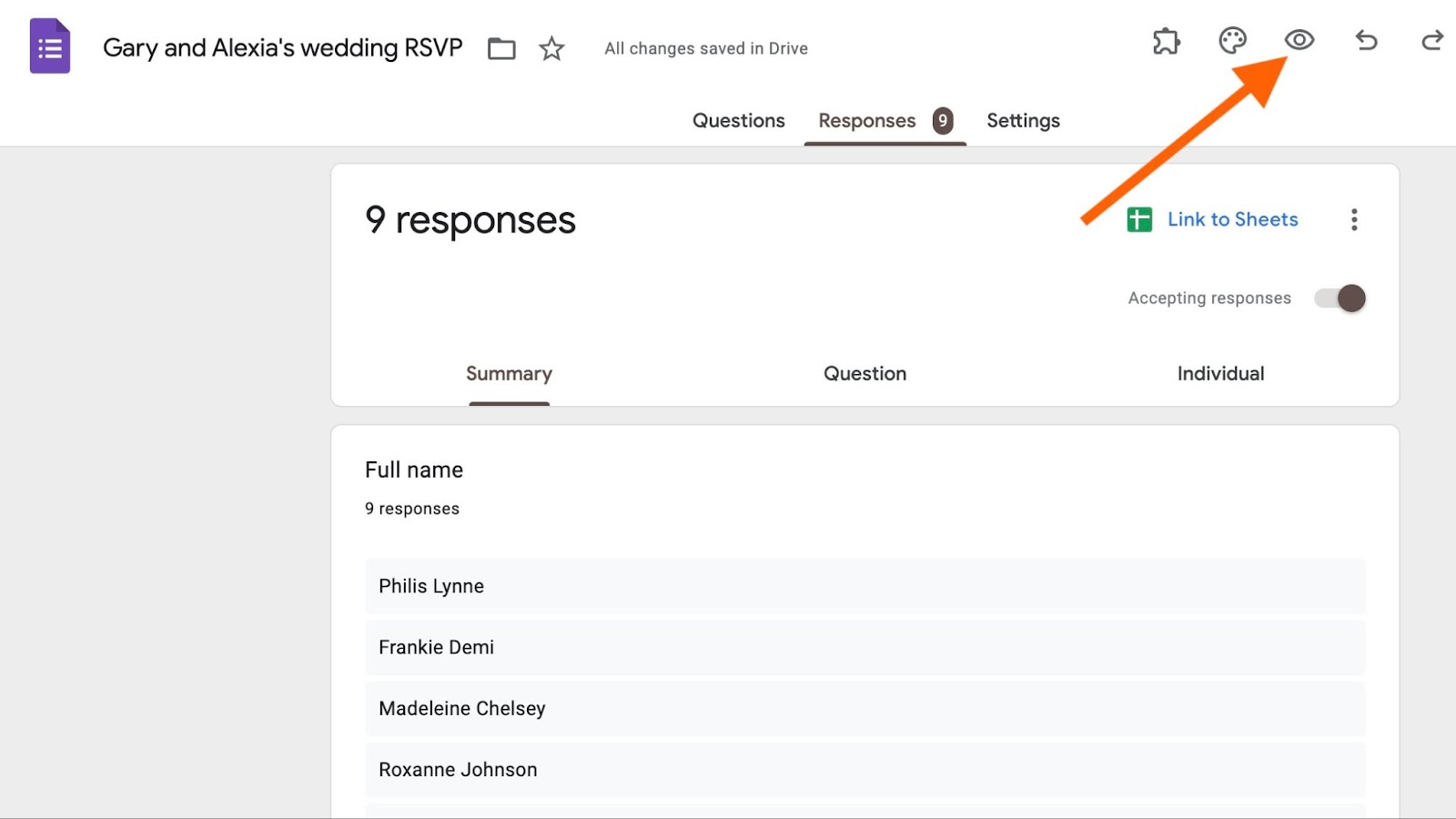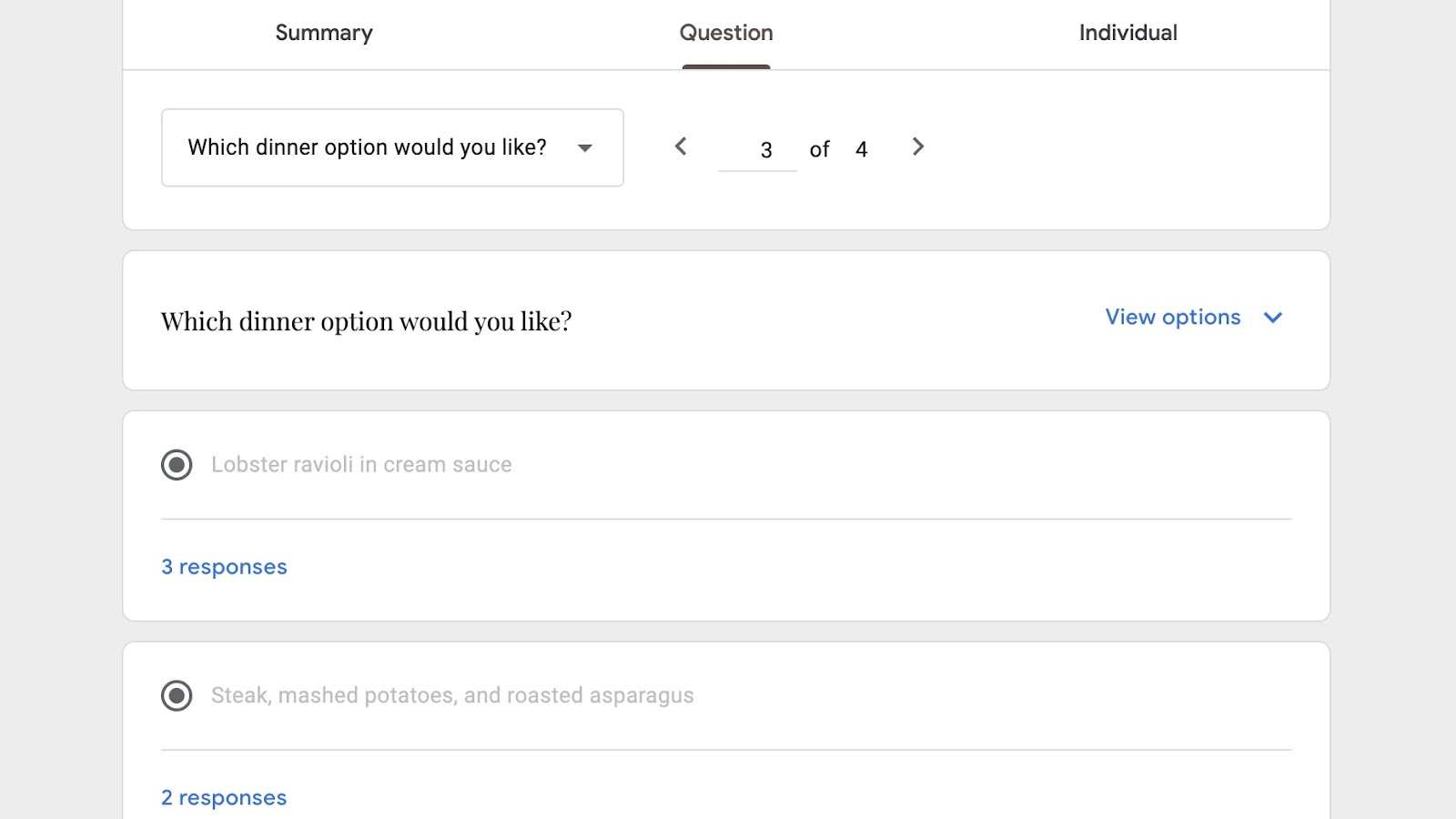 You can check on and manage your responses at any time by selecting Responses in the top tab of the form builder. You’re also able to change the view of your responses by selecting Summary, Question, or Individual.
