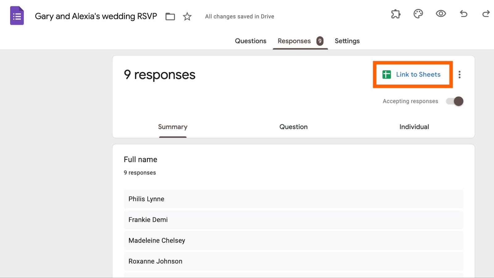 And if you want to track your responses through a spreadsheet, simply click on Link to Sheets in the top right corner of the Responses tab. This will automatically create a Google Sheet of your form’s submissions and will update as you receive more.